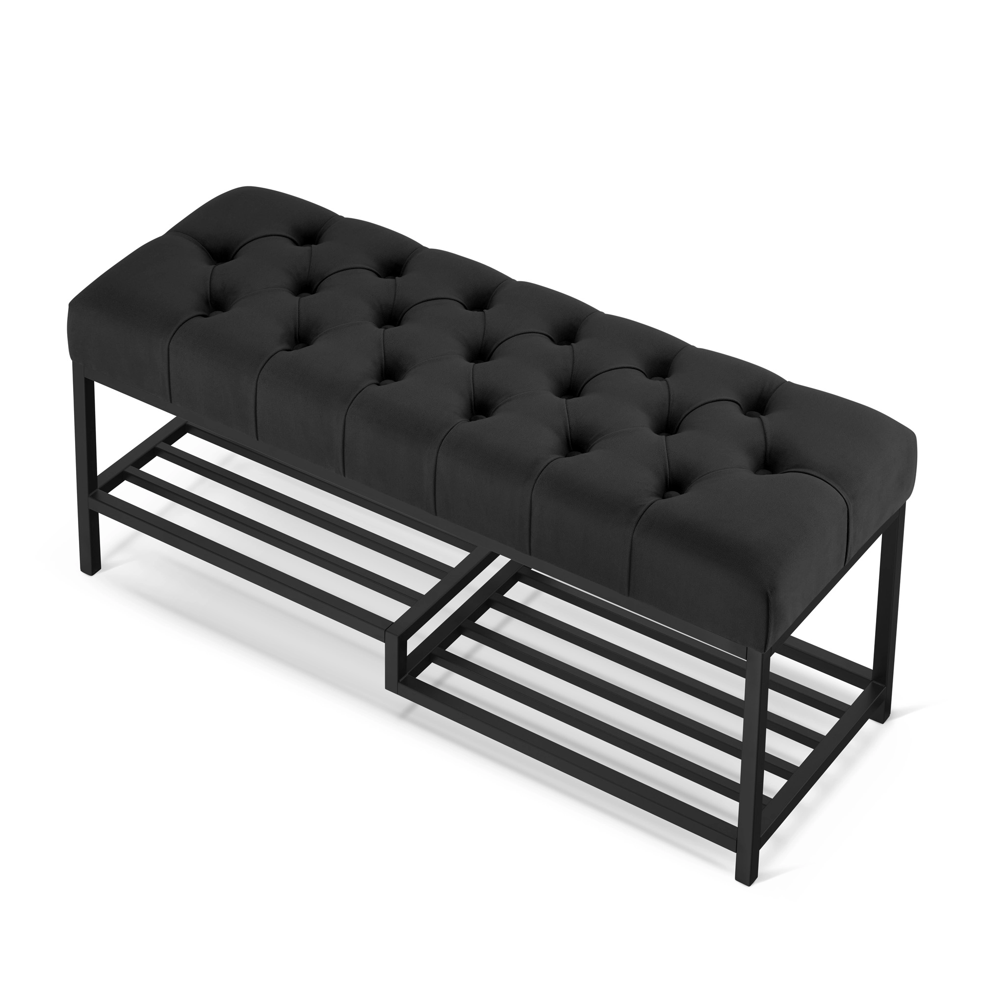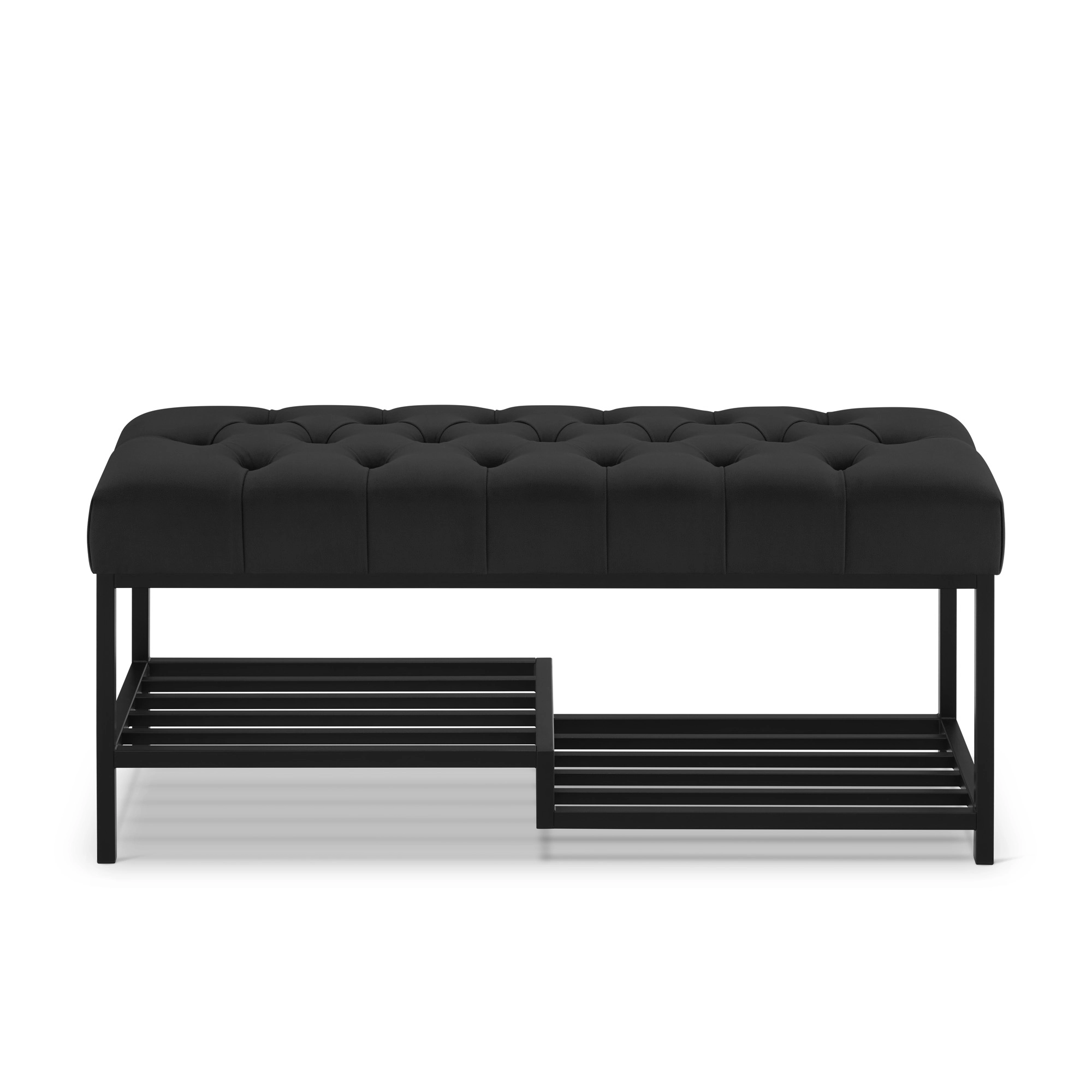 Deze bank met decoratieve capitonering en een asymmetrisch schap combineert comfort met een onderscheidende stijl. De zachte zitting zorgt voor extra comfort en het schap biedt ruimte voor schoenen. De stabiele stalen constructie en verfijnde details maken dit meubelstuk zowel aantrekkelijk als praktisch voor dagelijks gebruik.