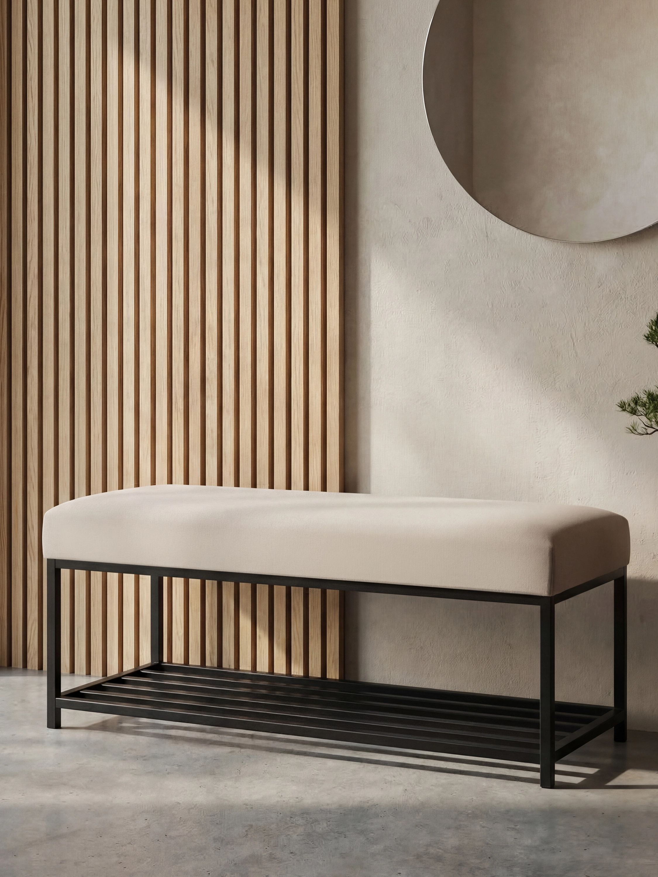De minimalistische vorm en de zwarte stalen constructie geven het geheel een moderne uitstraling met een subtiel industrieel karakter. De bank past perfect in Scandinavische, japandi en moderne interieurs zonder de ruimte te overheersen.