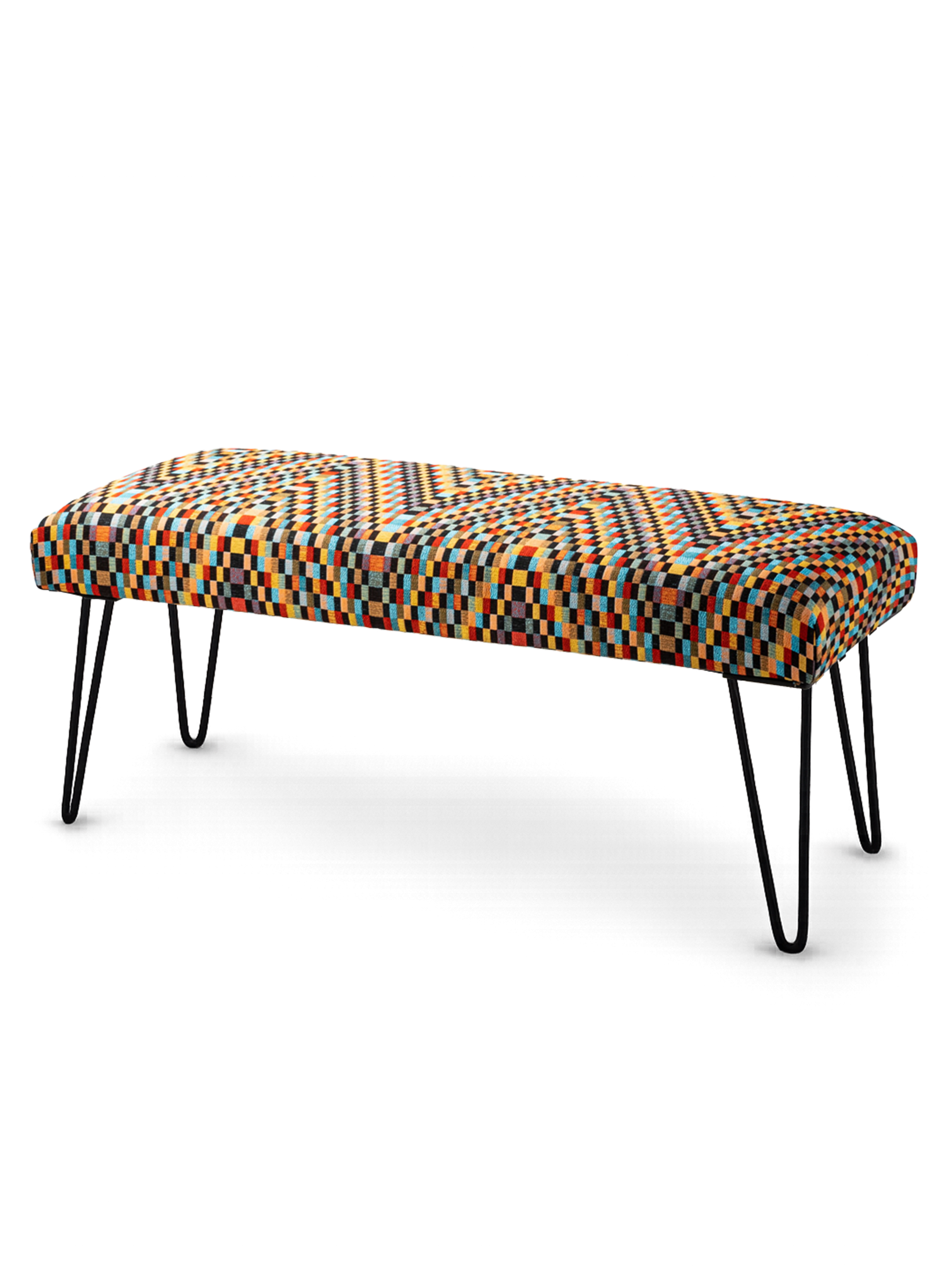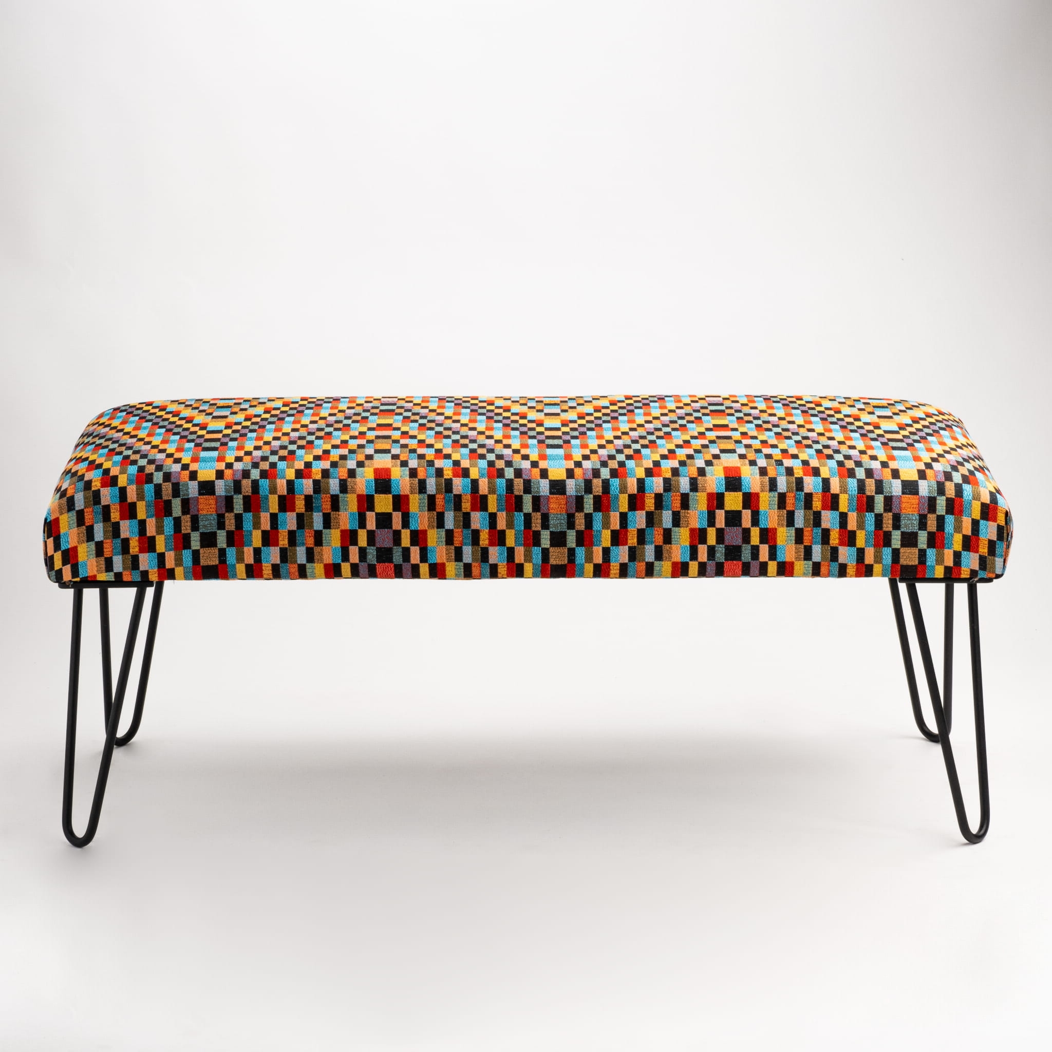 Een moderne bank met een gladde zitting in trendy veelkleurige geometrische patronen en metalen poten in HAIRPIN-stijl.