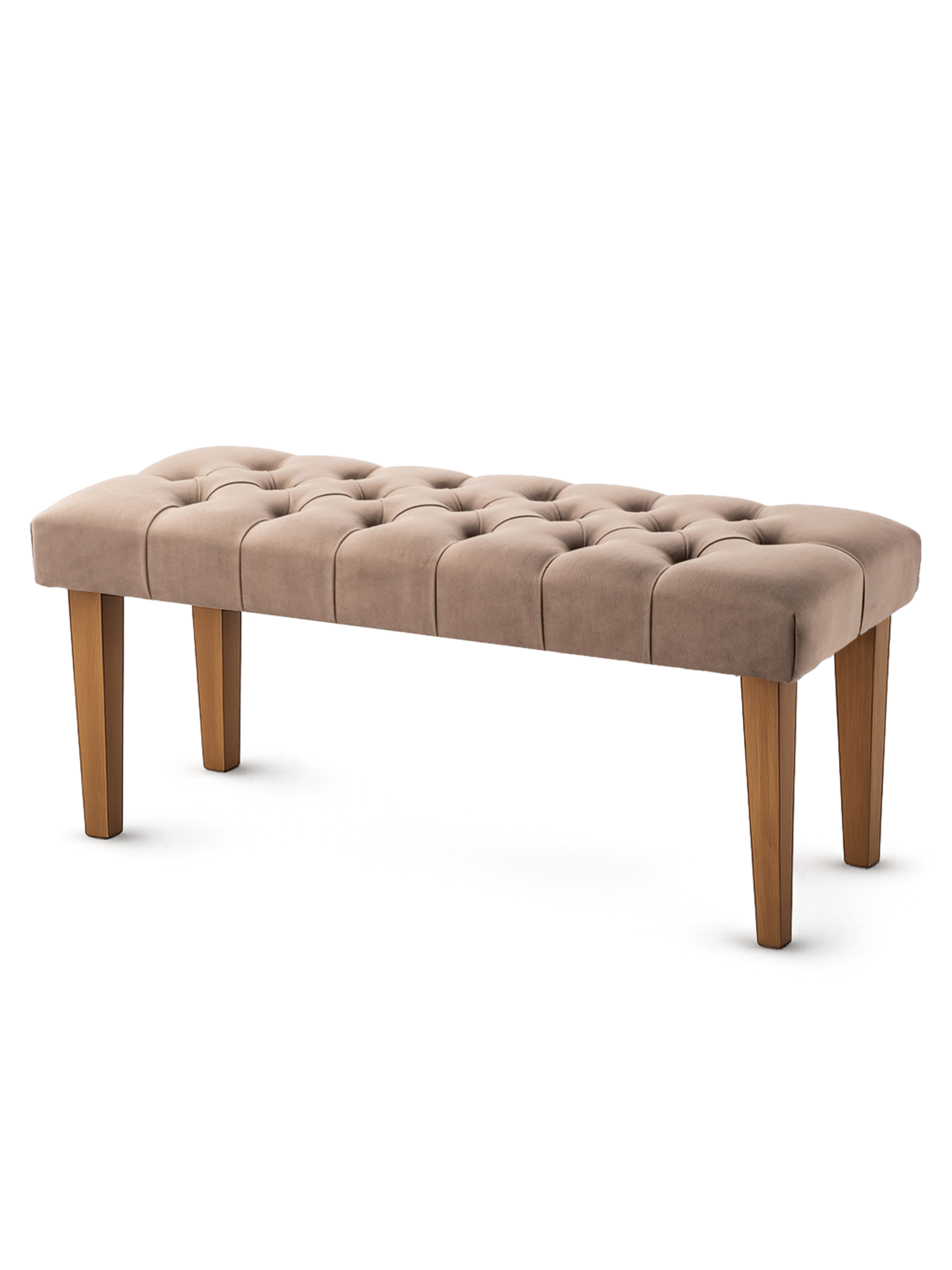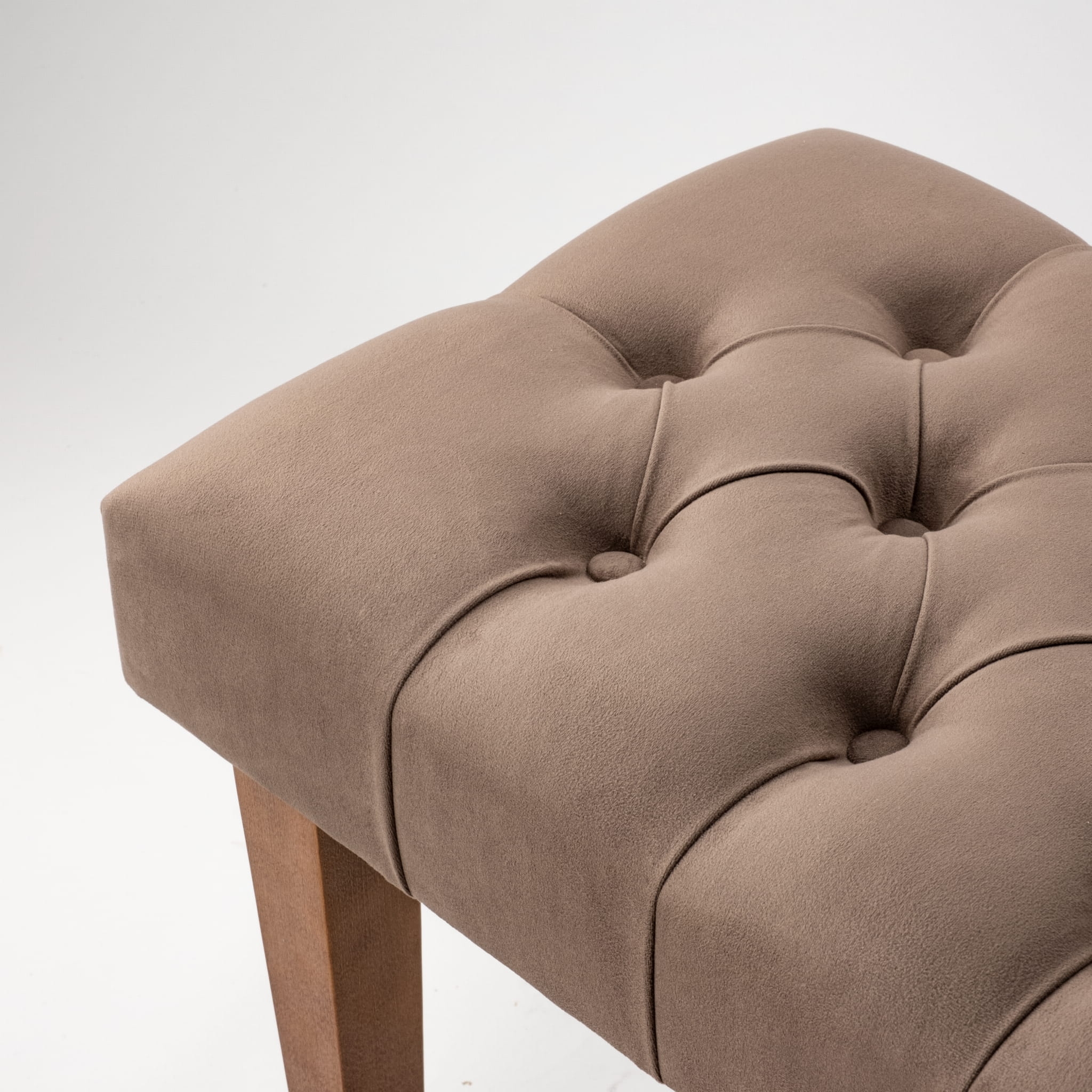 Een gestikuleerde halbank met massieve steenkleurige poten. De zitting is volledig handgemaakt, dus ziet er geweldig uit en gaat vele jaren mee. De stof die wordt gebruikt voor het maken van de bank is bestand tegen slijtage, vlekken en zonnestralen.