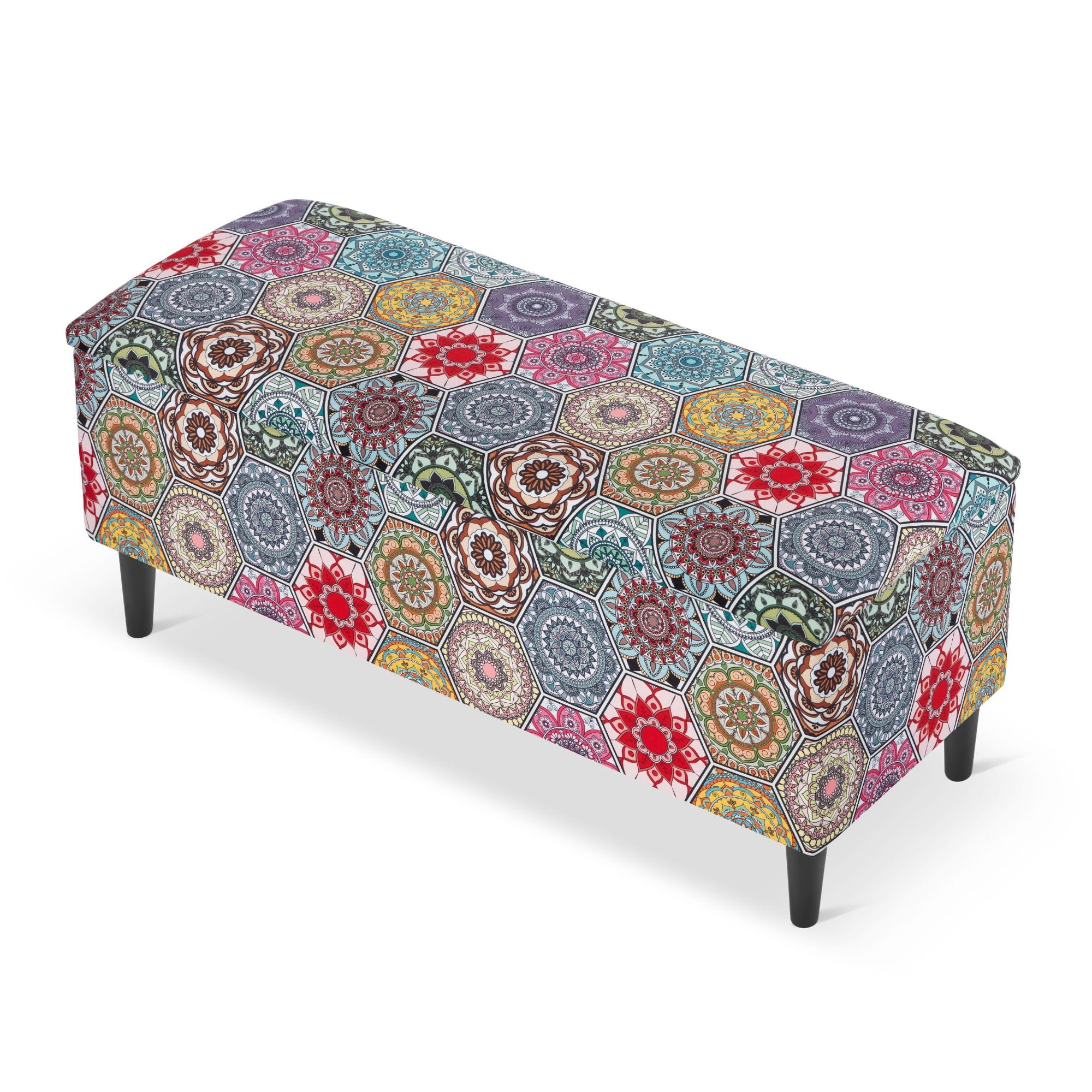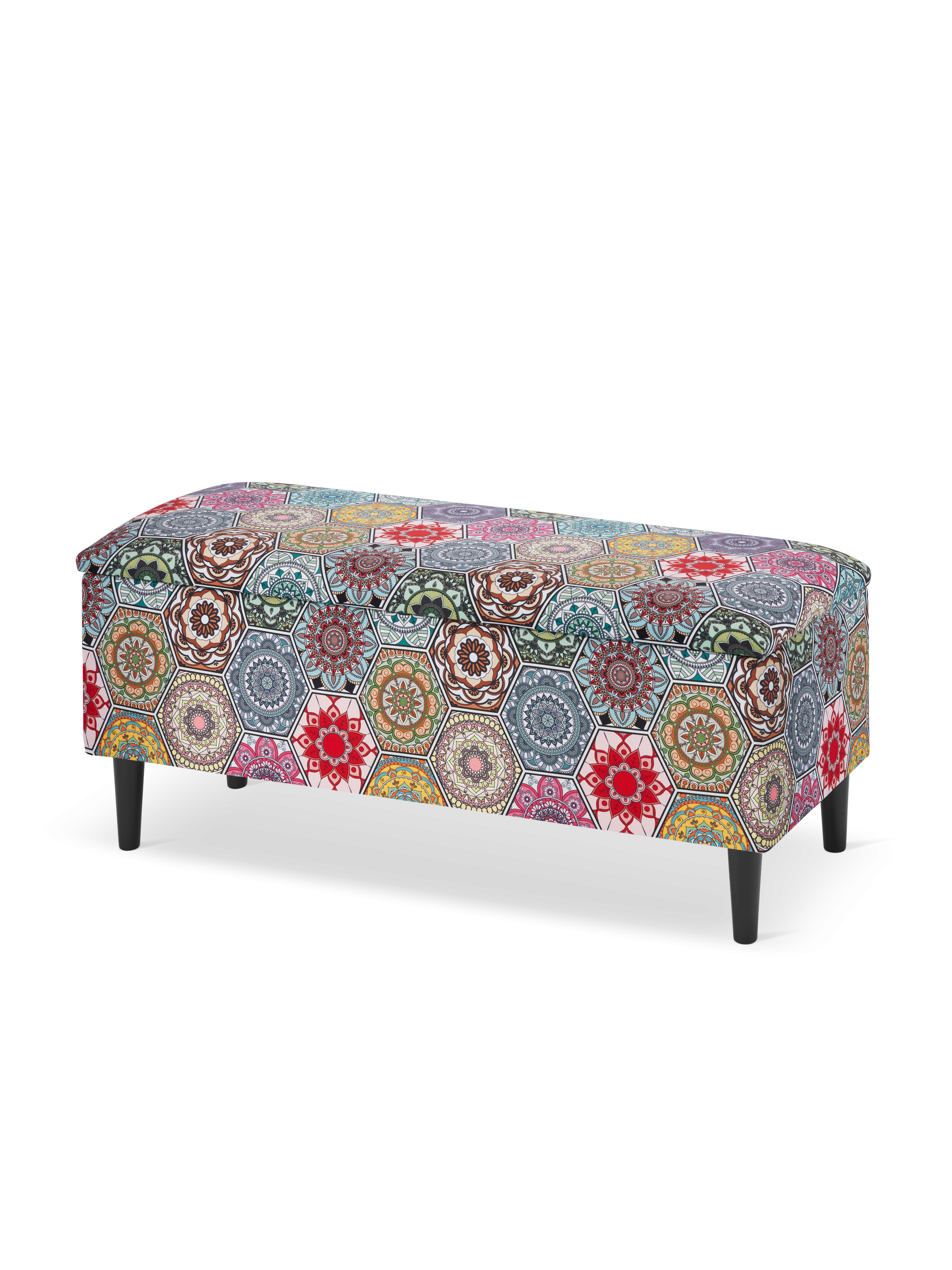 De oosterse patronen van de bekleding geven de opbergbankje een uniek karakter en een exotische charme, die een sfeer van mysterie en een vleugje exotisme of boho-stijl in de ruimte brengen. Naast zijn esthetiek biedt de opbergbankje met opbergruimte veel praktische voordelen. Dankzij de binnenruimte kunnen verschillende voorwerpen zoals dekens, kussens, tijdschriften of speelgoed worden opgeborgen.