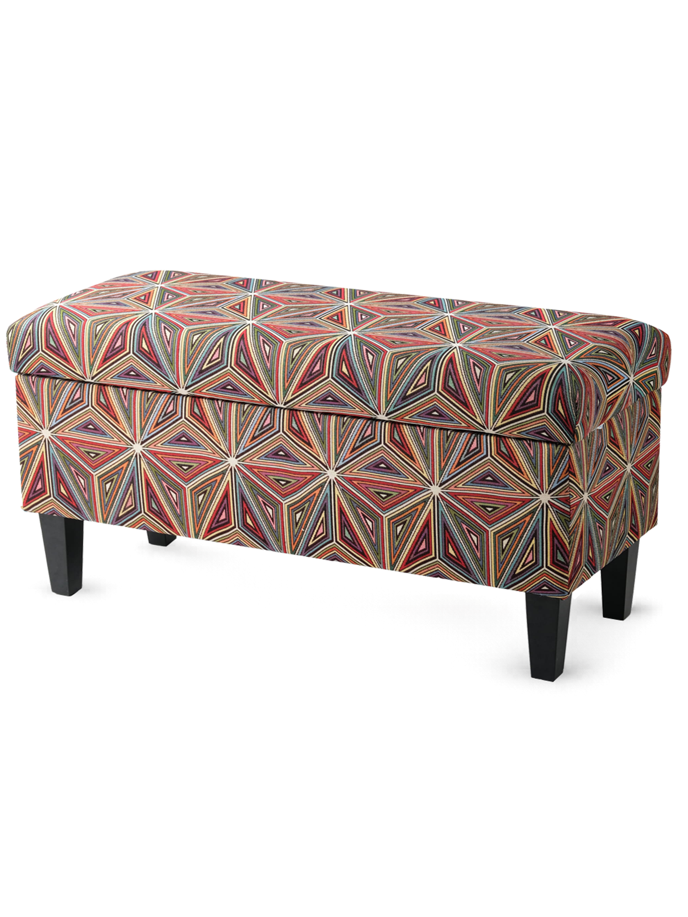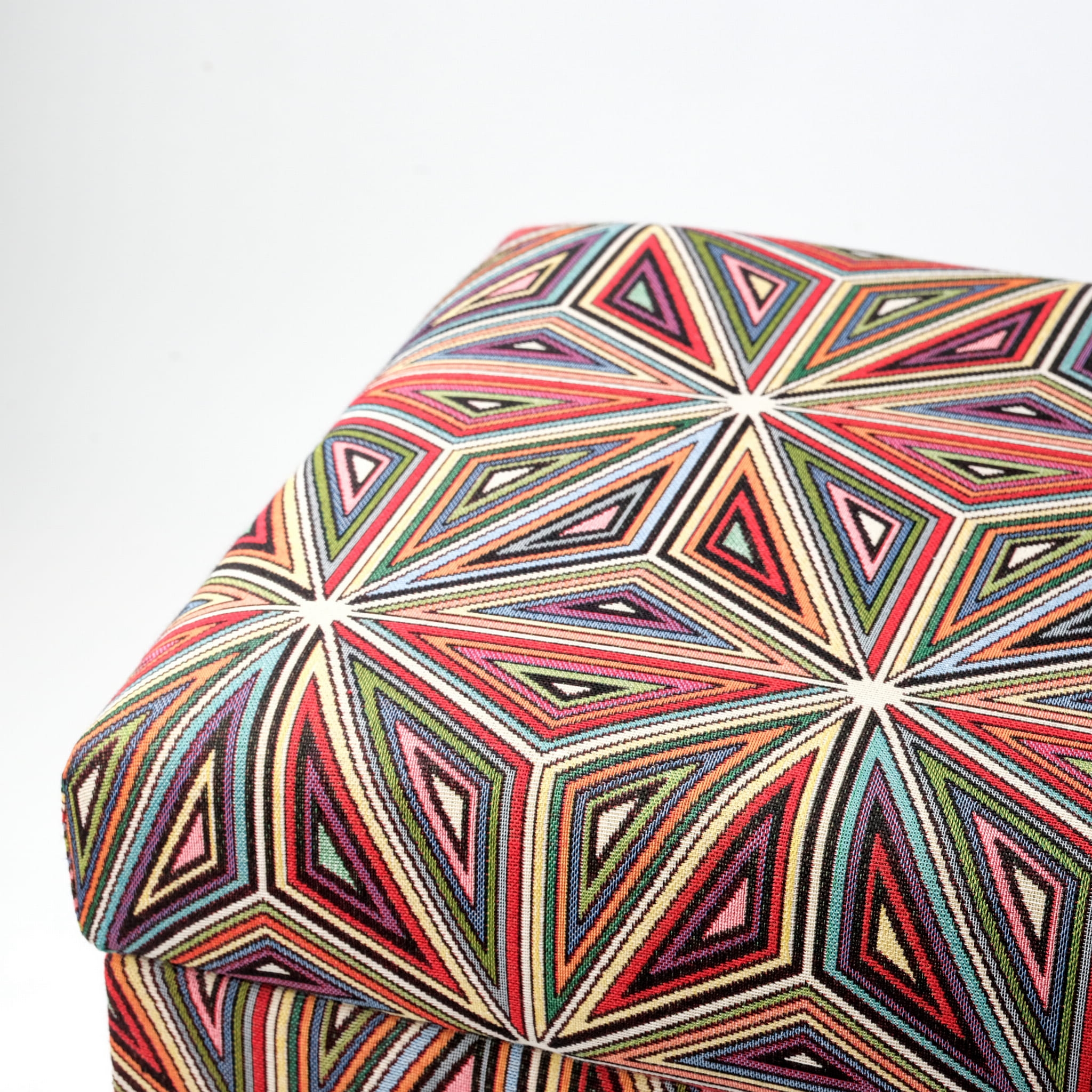 Patroonstoffen van Fibero zijn populair geworden vanwege geometrische patronen in levendige kleuren. Deze stof is bestand tegen slijtage, vlekken en zonlicht. De bank opent op poten, is gestoffeerd en volledig met de hand gemaakt. De zitting is gevuld met hypoallergeen schuim en watte. Ze worden geopend met stille veerscharnieren. De poten zijn gemaakt van geselecteerd klasse A beukenhout.