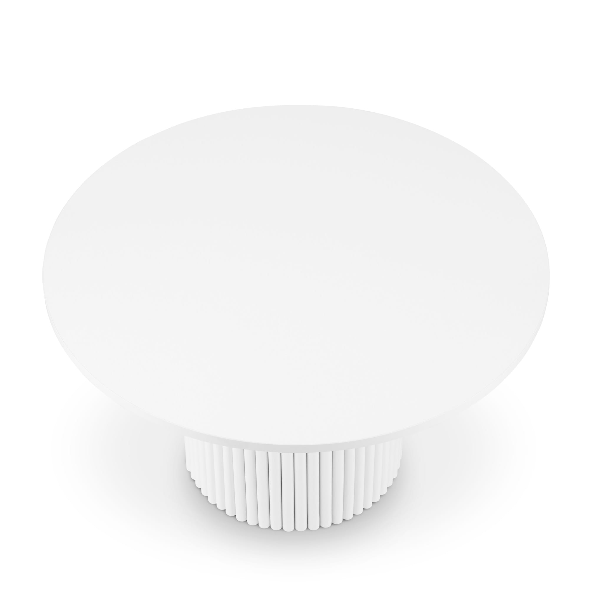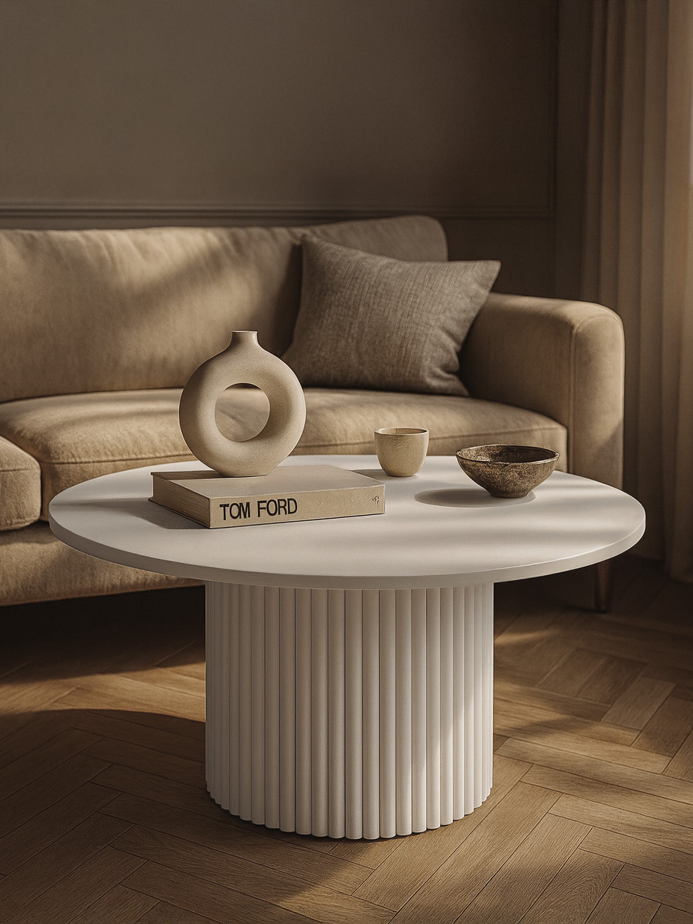 Opmerkelijke salontafels met een rond blad en geribbelde poten in verschillende maten en kleuren kunnen worden geplaatst in de woonkamer, slaapkamer of zelfs in de badkamer en dienen als bijzettafel of bloemenstandaard.