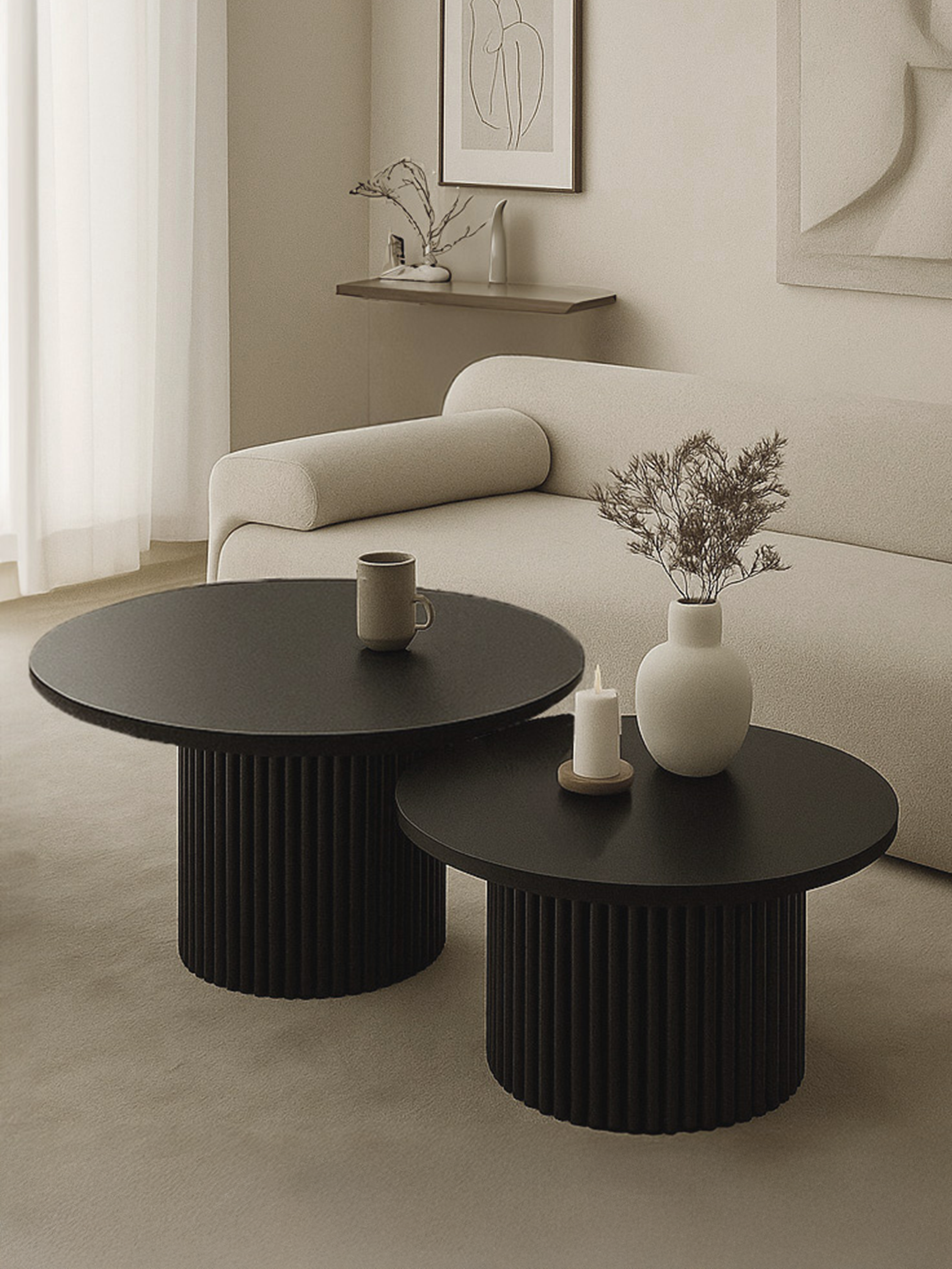Deze set van twee zwarte salontafels is een elegante en veelzijdige oplossing voor de woonkamer. Hun klassieke ontwerp en tijdloze zwart voegen moderniteit en stijl toe aan het interieur. De stevige constructie en hoogwaardige materialen garanderen duurzaamheid. De zwarte kleur is een symbool van elegantie en veelzijdigheid en past in verschillende opstellingen. Het is niet alleen een praktisch element, maar ook een opvallend accent dat het karakter van de kamer benadrukt.