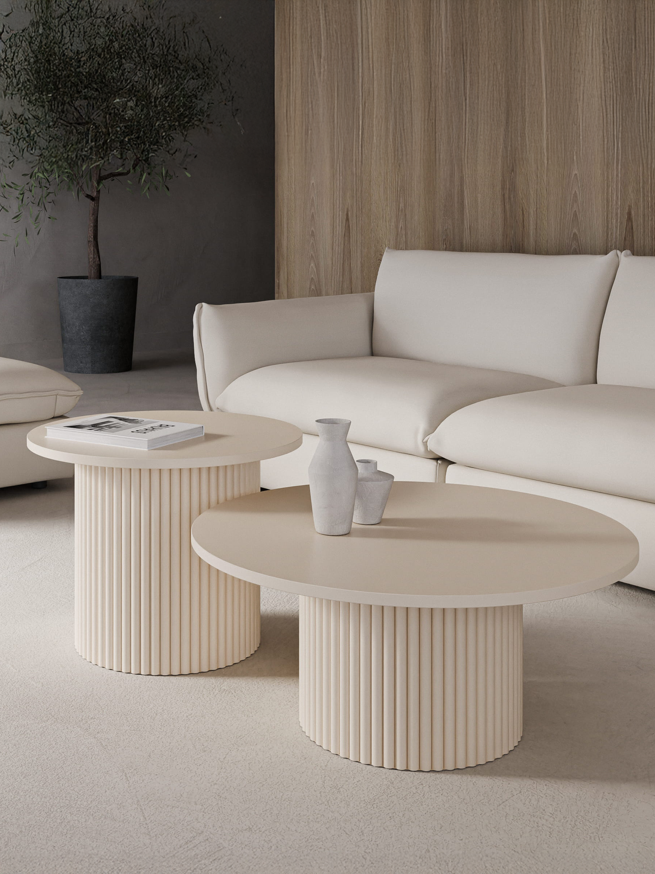Unieke salontafels met een rond blad en een geribbelde poot in verschillende maten en kleuren, ze passen in de woonkamer, slaapkamer of zelfs badkamer en dienen als bijzettafels of bloemenhouders.